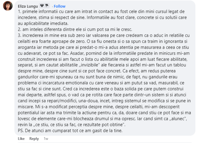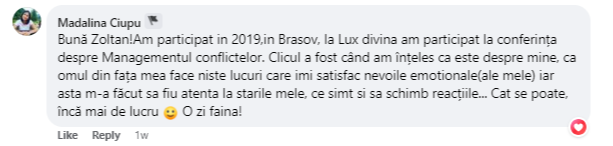 Recunosc, Zoltan am urmărit un singur curs cu tine, anul acesta , întâmplător pe fb v-am descoperit !,, Incredere. Respect. Stima de sine."